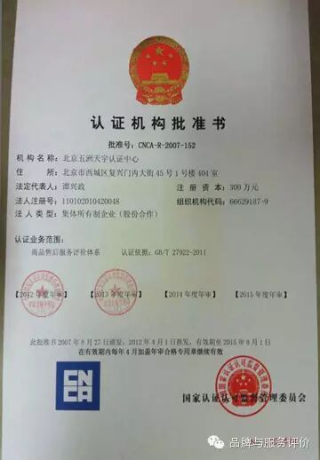 北京五洲天宇认证中心是由中华人民共和国商务部推荐(商建函[2007]28号),中国国家认证认可监督管理委员会按照《中华人民共和国认证认可管理条理》审查批准设立(批准号:CNCA—R—2007—152),在工商注册的具有独立法人地位的认证中心(注册号:110102010420048),是至今为止,国内、国际专业从事全国商品售后服务评价体系认证的唯一机构。