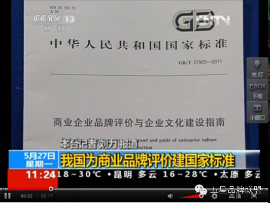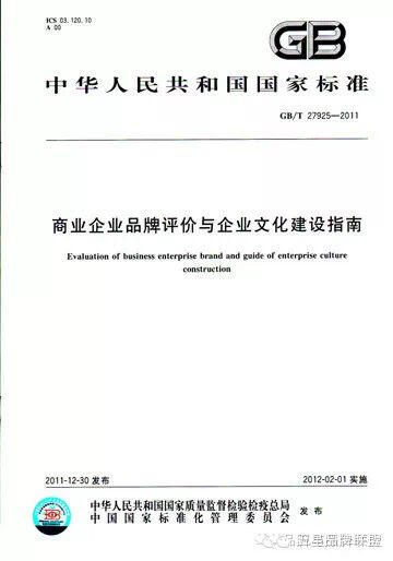由中国商业联合会牵头起草并归口的《商业企业品牌评价与企业文化建设指南》国家标准,由国家质检总局、国家标准委颁布,并于2012年2月1日起实施。这是国内首部关于企业品牌评价与企业文化建设的国家标准。