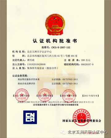 为落实贯彻国家“品牌强国”大政方针,进一步深入宣贯品牌评价国家标准,国家认监委于2014年9月17日批准北京五洲天宇认证中心认证扩项为:商业企业品牌评价认证。这是中国首次实施第三方品牌权威认证。认证依据仍然是《商业企业品牌评价与企业文化建设指南》国家标准,据此标准,将对商业企业品牌进行打分,并根据最终得分确定品牌星级(二星、三星、四星、五星)。